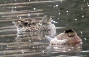 Blue-winged Teal behind the resting Ruddy Duck. ID photo.