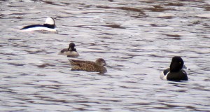 Female Blue-winged Teal with Ring-necked Duck and Buffleheads. Click picture for full-sized view. (Photo by J. Klizas)