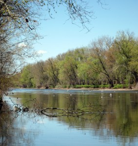 The Bonaparte’s Gulls (BOGU) continue to stage in the Raritan River and are viewable from the Delaware and Raritan Canal towpath in Franklin Township, Somerset County. Some were visible today from the base of the I-287 Bridge near exit 10 (Easton Ave.). Walking approximately one mile south on the towpath to a gas pipeline crossing the river gave one the view depicted in the pictures below. There were 85 BOGUs at this spot. Since the towpath is four miles long from the I-287 Bridge to Landing Lane, most of the BOGUs were probably south of this spot meaning that the full contingent of over 300 gulls found yesterday are still present.