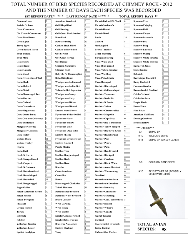 The up-to-date 2012 Bird Checklist follows the raptor totals. It is actually an image file so you can click on it to open it on another page.