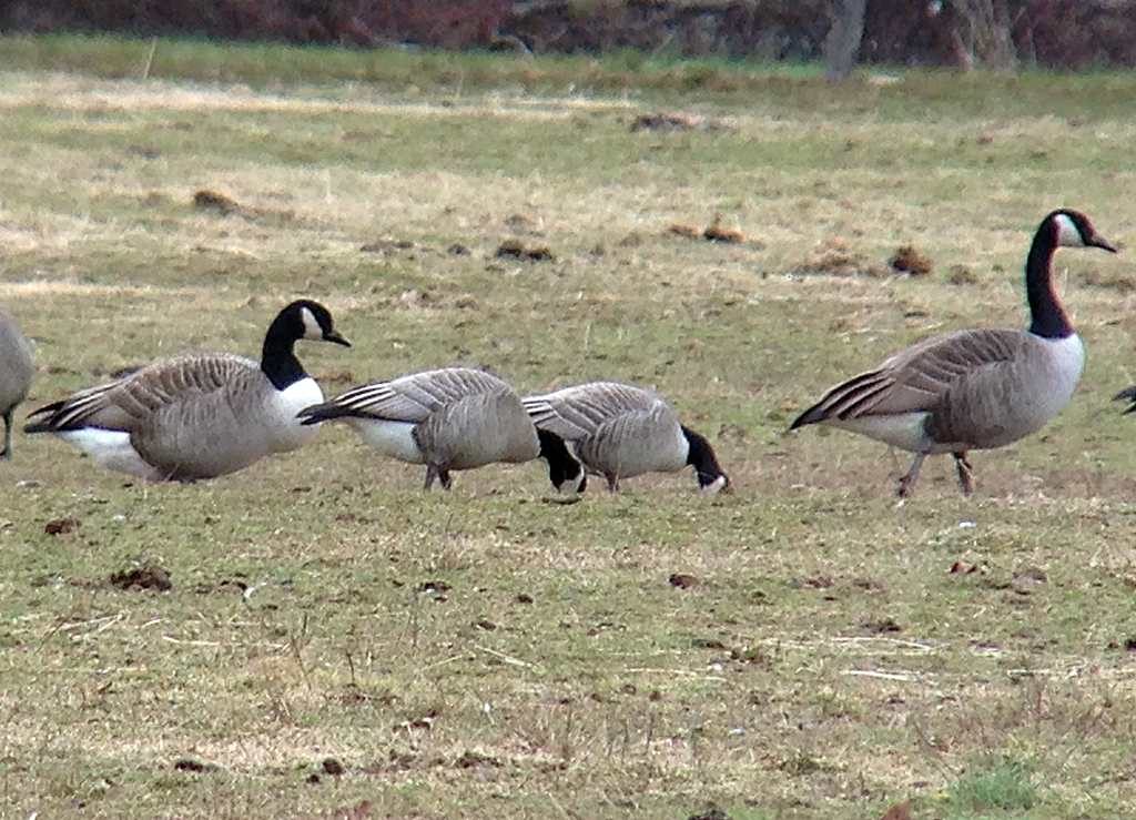 Two Cackling Geese feeding at the equestrian fields on Lord Stirling Road, Basking Ridge, NJ, Jan. 17, 2013 (Photo by Jeff Ellerbusch).