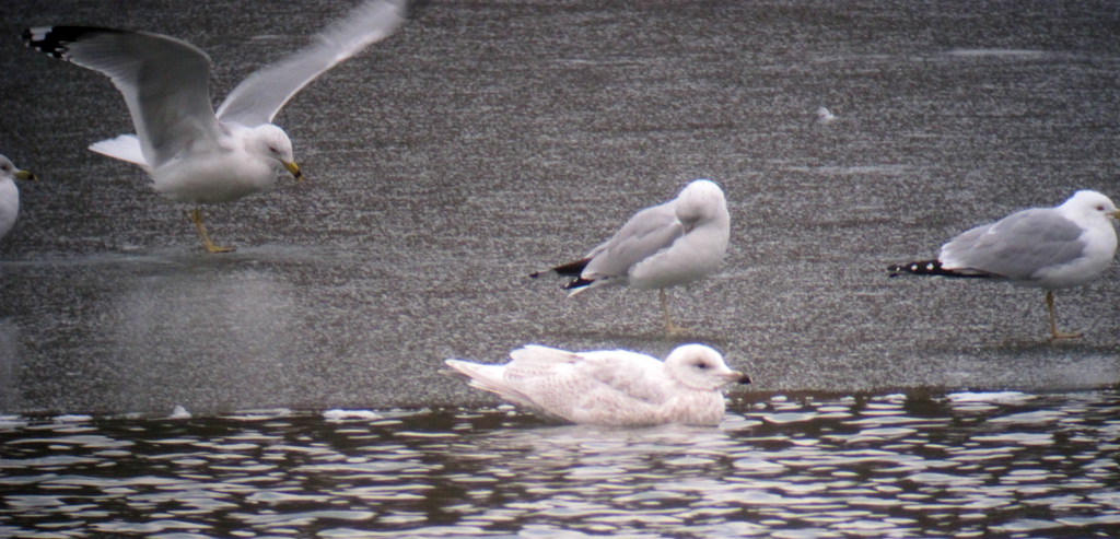 Iceland Gull with Ring-billed Gulls, Mt. Hope Pond, Rockaway Township, NJ, Mar. 2, 2013 (digiscoped by Jonathan Klizas).