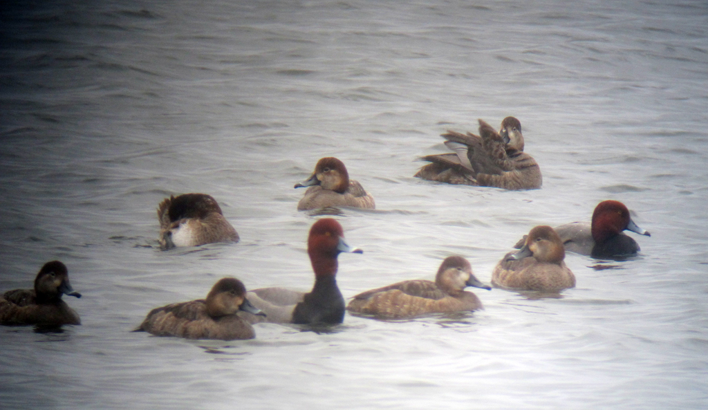 9 of the 14 Redheads at Budd Lake, NJ, Mar. 7, 2013 (digiscoped by Jonathan Klizas).