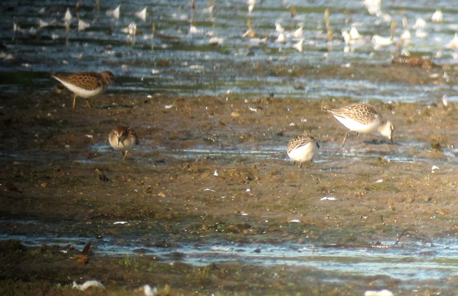 Least and Semipalmated Sandpipers, Lincoln Park, NJ, Sep. 7, 2013 (digiscoped by Jonathan Klizas).
