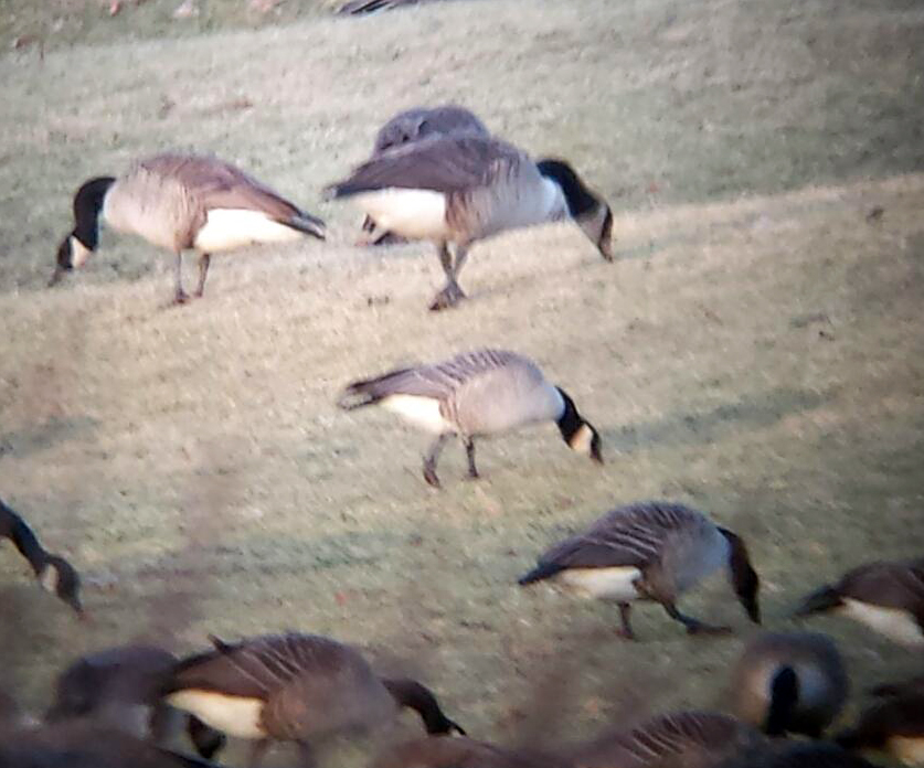 Cackling Goose with Canada Geese, Florham Park, NJ, Jan. 12, 2014 (digi-phone-scoped by Jamie Glydon)