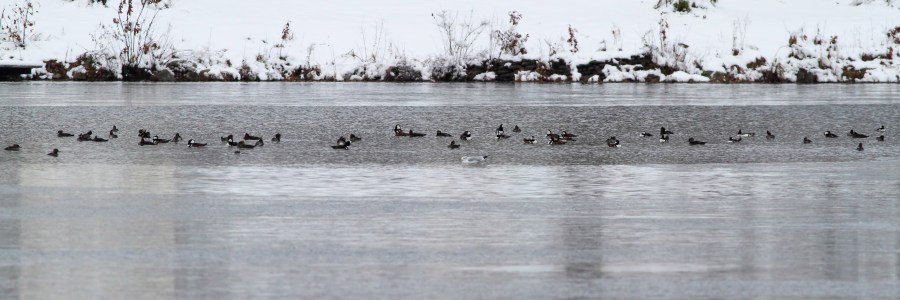 Approx. half of the Hooded Mergansers at Lk. Musconetcong, NJ, Nov. 29, 2014 (photo by Jonathan Klizas).