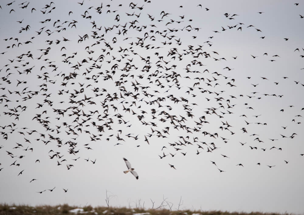 European Starlings and Northern Harrier, Hanover Twp., NJ, Nov. 30, 2014 (photo by Chuck Hantis)