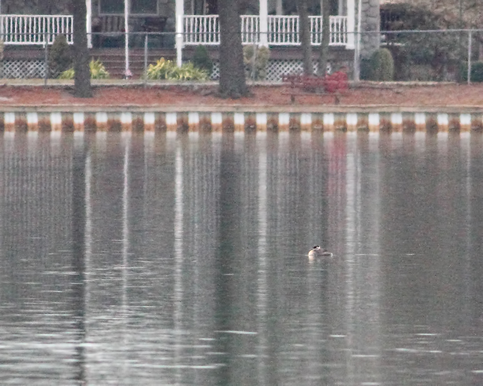 Noisy, distant photo of a Red-necked Grebe, Lake Parsippany, NJ, Apr. 3, 2015 (photo by Jonathan Klizas)