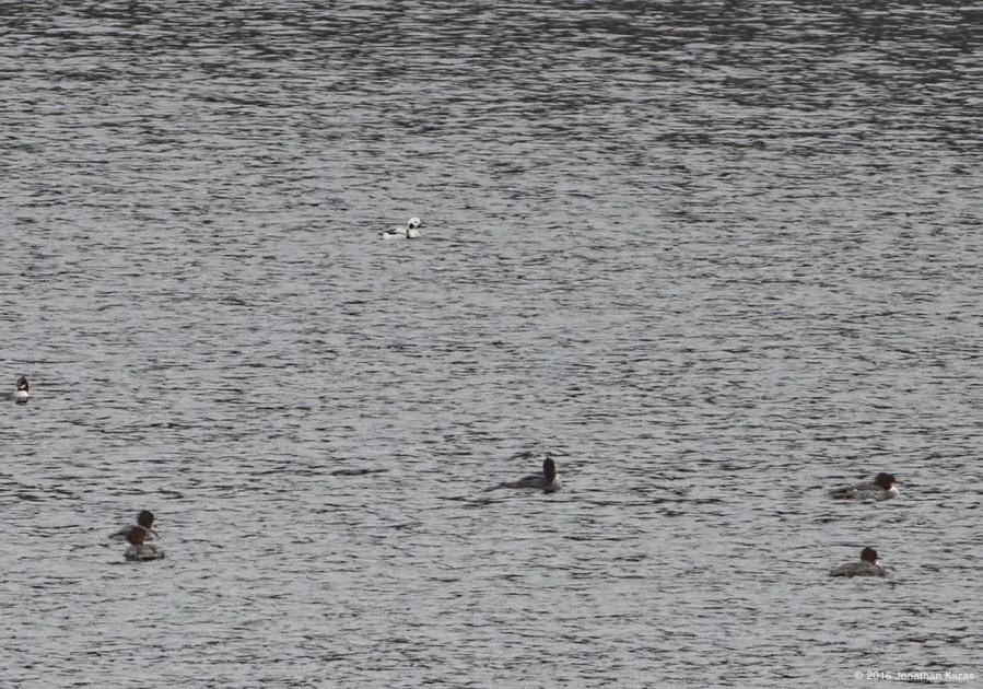 Long-tailed Duck with Common Mergansers, Clyde Potts Reservoir, Mendham Twp., NJ, Jan. 9, 2016 (photo by Jonathan Klizas)