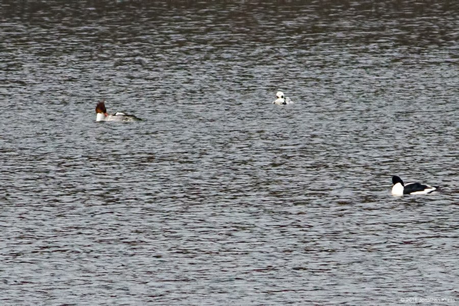 Long-tailed Duck with Common Mergansers, Clyde Potts Reservoir, Mendham Twp., NJ, Jan. 16, 2016 (photo by Jonathan Klizas)
