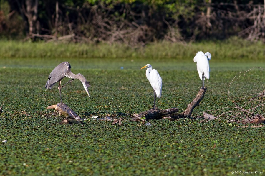 Great Egrets, Great Blue Heron, Lincoln Park Gravel Pits, Morris Co., NJ, Aug. 14, 2016 (photo by Jonathan Klizas)