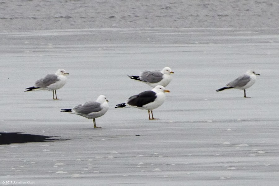 Lesser Black-backed Gull with Ring-billed Gulls, Lake Musconetcong, NJ, Mar. 26, 2017 (photo by Jonathan Klizas)