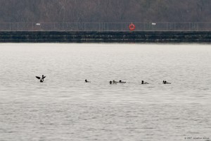 Other storm-related birds were at Boonton Reservoir on March 28: 9 Red-breasted Mergansers (8 in the photo below), 2 Red-throated Loons, 3 Common Loons and a Horned Grebe.