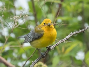 Based on that criteria, the PROW in the photographs is a female as it has clearly been seen carrying twigs, grasses and other nesting materials but never moss. For a comparison, this observer watched a male PROW at the Lincoln Park Gravel Pits in May, 2016. It sang continuously only stopping to gather mossy material and placing it in one or two tree cavities. Unfortunately, it apparently never found a mate. This corroborates the Birds of North America statement.