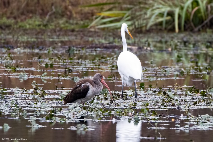 White Ibis with Great Egret, Speedwell Lake, Morristown, NJ, Nov. 1, 2017 (photo by Jonathan Klizas)