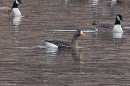 Greater White-fronted Goose with Canada Geese, Clyde Potts Reservoir, NJ, Feb. 4, 2018 (photo by Jonathan Klizas)