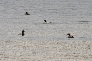 Canvasbacks (Common Mergansers in the background), Lake Parsippany, NJ, Feb. 24, 2018 (photo by Jonathan Klizas)