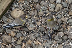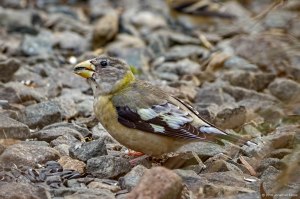 While observers viewed from the upper deck at Scherman Hoffman Sanctuary the Evening Grosbeaks displayed an effective camouflage against the stones.