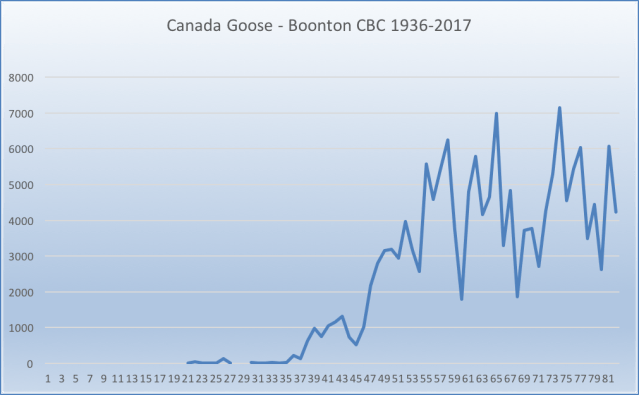 Here is a graph illustrating the impressive expansion of the Canada Goose on the Boonton CBC. The X, or horizontal, axis is represented as the years of the count: 1 =1936, 81 = 2016, etc. The Y, or vertical, axis is the total amount of geese.